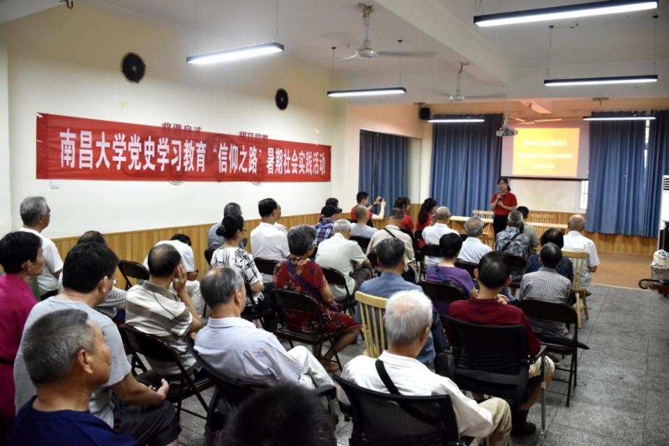 本網(wǎng)訊(團(tuán)委)近日,南昌大學(xué)黨史學(xué)習(xí)教育“信仰之路”暑期社會(huì)實(shí)踐隊(duì)選取南昌市青云譜區(qū)徐坊社區(qū)作為第一站,開展首場(chǎng)宣講活動(dòng)。在徐坊社區(qū)的七一主題黨日活動(dòng)中,學(xué)校師生分別圍繞“從紅船啟航 育紅色沃土”“立潮頭乘風(fēng)破浪 學(xué)黨史崇德力行”“錚錚誓詞 終身堅(jiān)守”等主題,為社區(qū)老黨員們講述了“信仰之路”黨史微課。